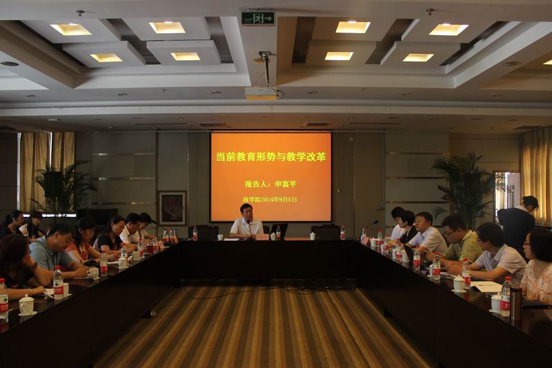 9月5日,商学院邀请公司党委常委、副董事长申富平教授作题为“当前教育形势与教育改革”的学术报告。报告会由商学院经理王小平主持,商学院班子成员及全体教师参加。