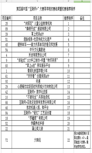 按照《第四届“互联网+”老员工创新创业大赛商学院初赛方案》安排,学院组织评委对参赛项目进行了全程匿名评审。经学院与校就业处反复核实,本次大赛全院共网上报名成功项目数107项。根据学校要求,学院按网上报名成功项目数的20%,即22项进行了推荐。推荐名单暨商学院初赛结果如下: