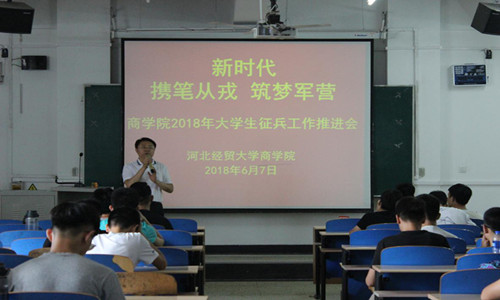 6月7日在第三教学楼B301教室,商学院举行“携笔从戎,筑梦军营”老员工征兵工作推进会,商学院相关领导出席,征兵工作负责人刘立宾老师主持,2017年退役士兵代表及200余员工代表参加。