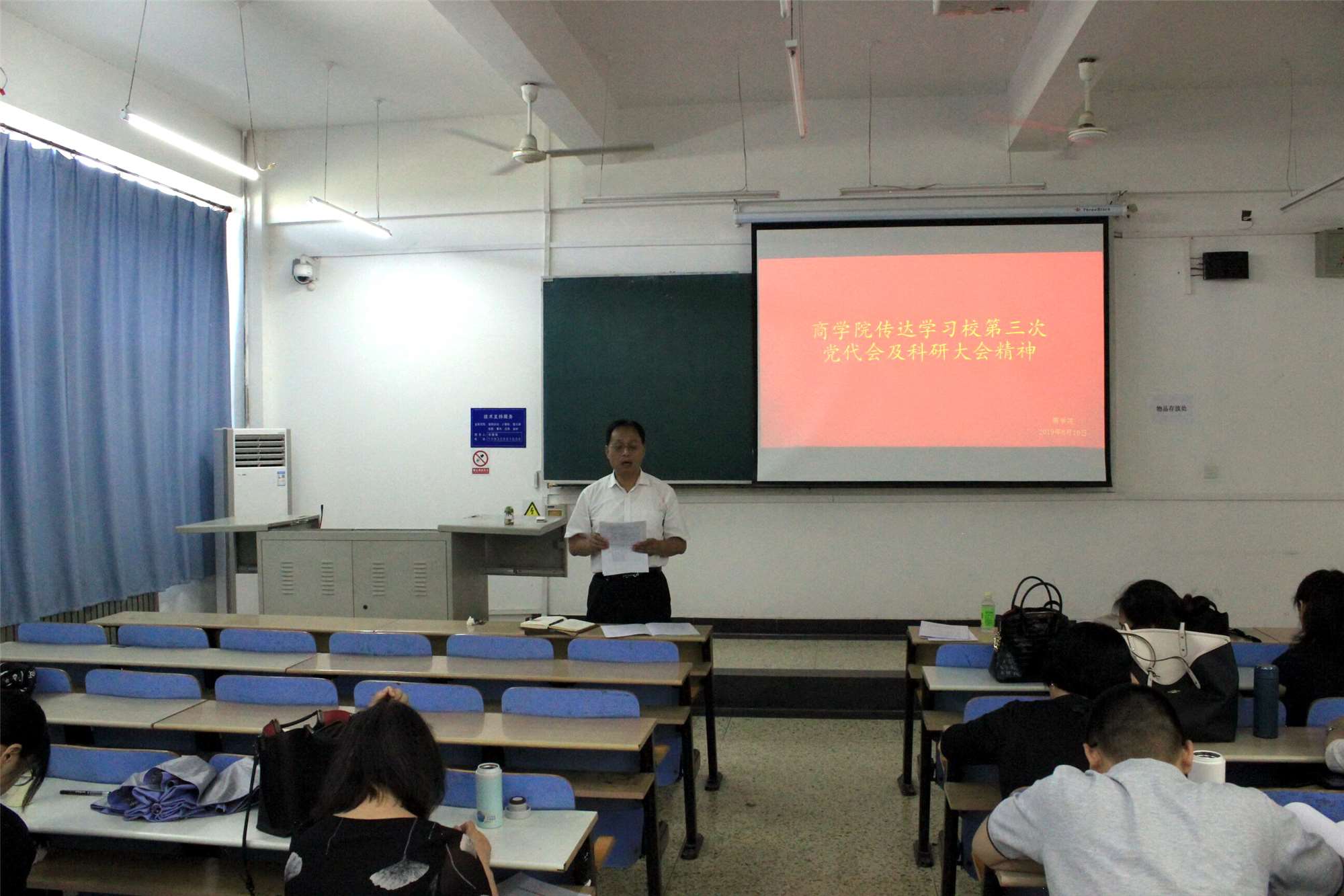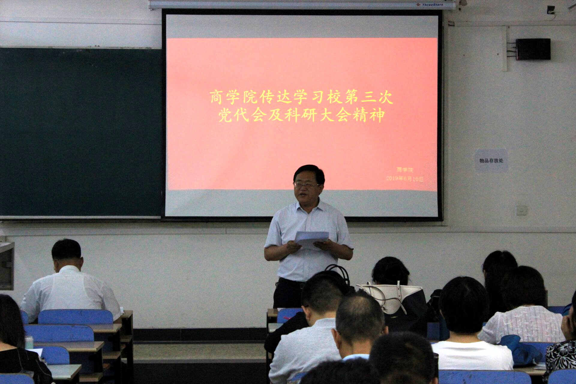 6月10日下午,商学院在第三教学楼B302教室集体传达学习了公司第三次党代会及2019年科研工作大会精神。公司党委书记马兵林、经理王小平分别主讲,全院教职工80余人参加。