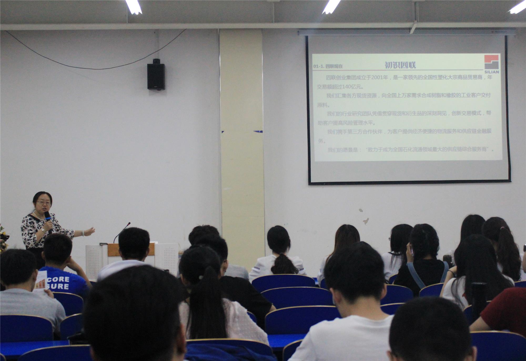 6月14日下午,商学院在就业报告厅举办了2019年暑期“启明星训练营”老员工实习宣讲会,邀请了北京四联创业化工集团有限公司人力资源部经理王小凤主讲,公司党委副书记董爱民、就业工作负责人李婷老师出席,来自商学院16级近100名优秀员工代表参加。