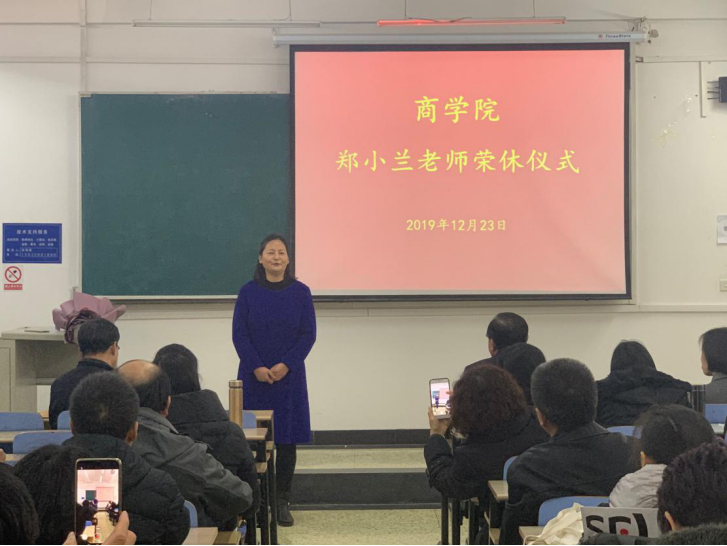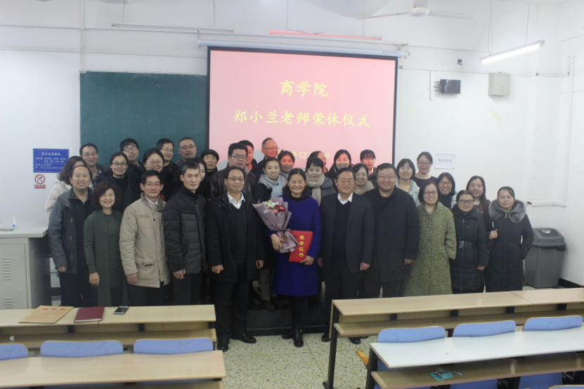 12月23日下午,商学院在B教302教室举办郑小兰老师荣休仪式。仪式由经理王小平主持,学院领导班子和80余名教师参加。