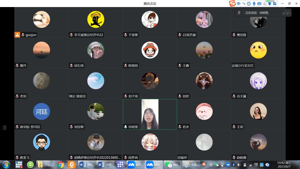 2023年6月7日晚7点,公司理论经济学师生在腾讯会议上开展硕士毕业生交流分享活动。分享会邀请了2020级、2019级毕业生介绍就业经验和考博经验,2021级、2022级在校研究生参加交流。分享会由柴国俊老师主持,刘华光经理、辅导员唐洁老师以及导师代表薛龙飞老师、李博老师参会。