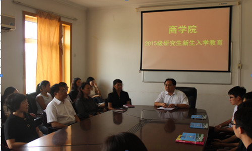 9月8日上午,商学院召开2015级硕士研究生新生入学教育。商公司党委书记邢静义、经理王小平、党委副书记董爱民、副经理戎素云、副经理焦知岳、研究生管理办公室主任程丽梅和研究生辅导员李珊珊,以及商学院2015级全体硕士研究生参加。