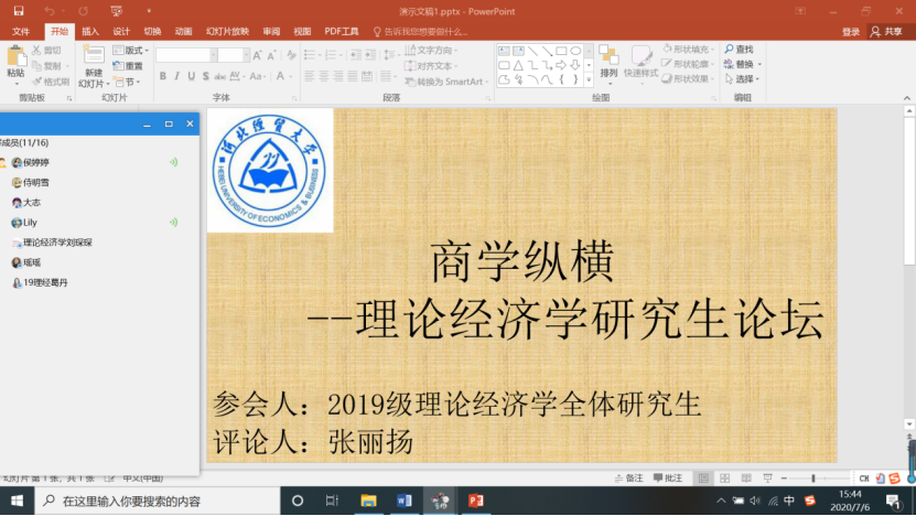 7月6日下午,商学院举办了“商学纵横”之理论经济学研究生论坛。受疫情影响,此次学术活动以线上会议的方式进行。2019级理论经济学6名研究生参加了本次论坛。2018级研究生张丽扬对论坛报告进行了点评。