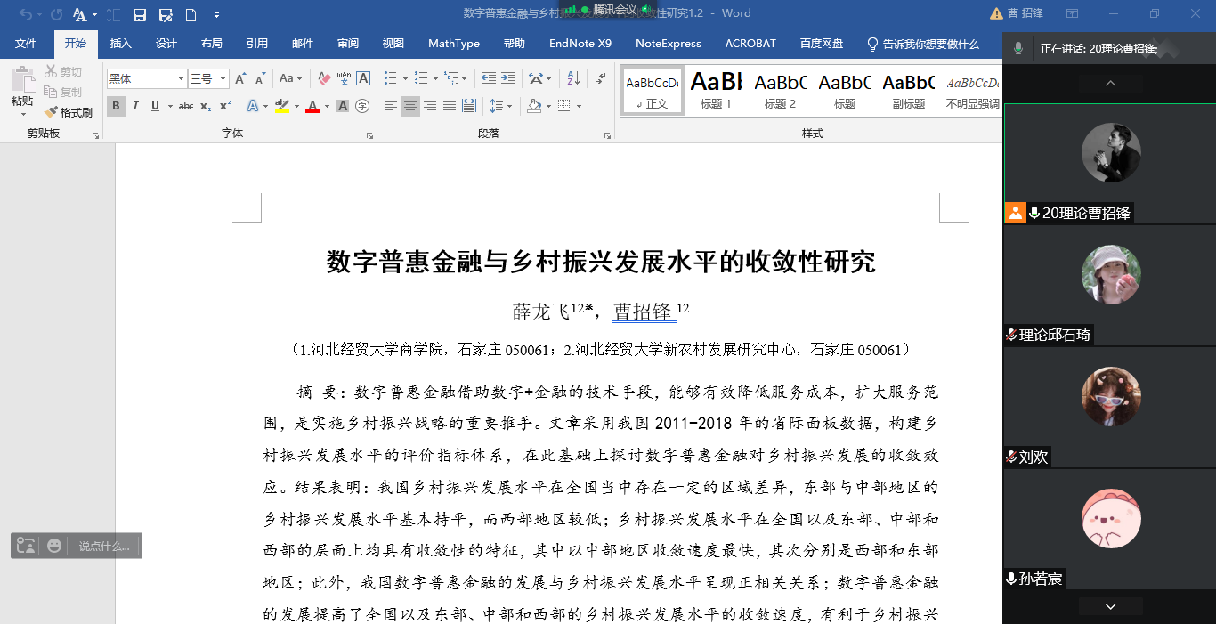 本次线上论坛的汇报人为:孙若宸、刘欢、曹招锋、邱石琦、陈晓旭和谷天翼。汇报的研究主题分别为《A room of one's own: housing consumption and residential crowding in transitional urban China》、《平台经济的机会与挑战》、《数字普惠金融与乡村振兴发展水平的收敛性研究》、《论农村土地集体所有制的优势》、《共享经济的实质——基于马克思主义政治经济学视角的分析》、《我国慈善基金会捐赠收入影响因素研究》。同学们就选题角度、研究方法和研究过程中出现的问题加以讨论,之后又着重探讨了论文投稿方面的相关问题。诸如如何选择投稿期刊、如何回复主编的修改意见等。