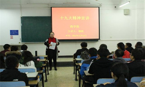 11月13日晚,商学院在第三教学楼B302教室举行十九大精神宣讲主题党课,党课分别由商公司党委副书记董爱民、商学院辅导员穆娟、校十佳老员工孙立同学授课,商学院员工党员、入党积极分及员工代表100余人参加。