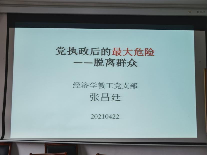 2021年4月22日下午,商学院经济学系在学院西会议室举办第七期“党建论坛”。论坛由支部书记王书军主持,张昌廷老师主讲,经济学系教师党支部全体党员和经济学系其他教师参加。