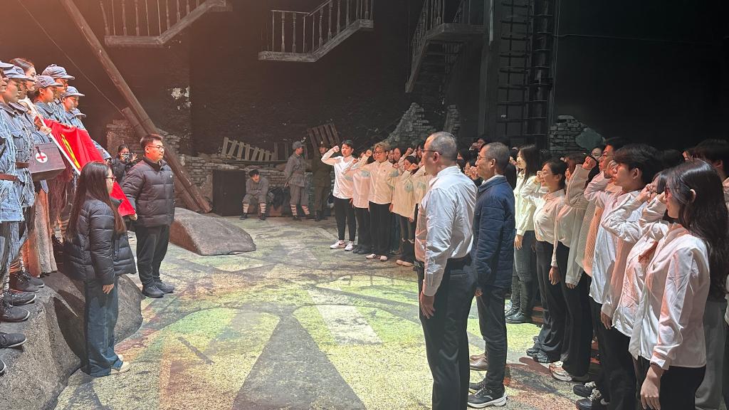 随后,党员师生们观看了《石家庄·1947》沉浸式演出,身临其境地体验1947年解放前夕那段燃烧的红色岁月,去亲历地下党员为解放石家庄战役深入虎穴、不畏牺牲地与敌残酷斗争,去感受我党各级情报人员赤诚的梦想与热血。观看中不少师生党员被地下党员受严刑拷打却仍毫不退缩、解放军战士一批批倒下等演出情景所感染。