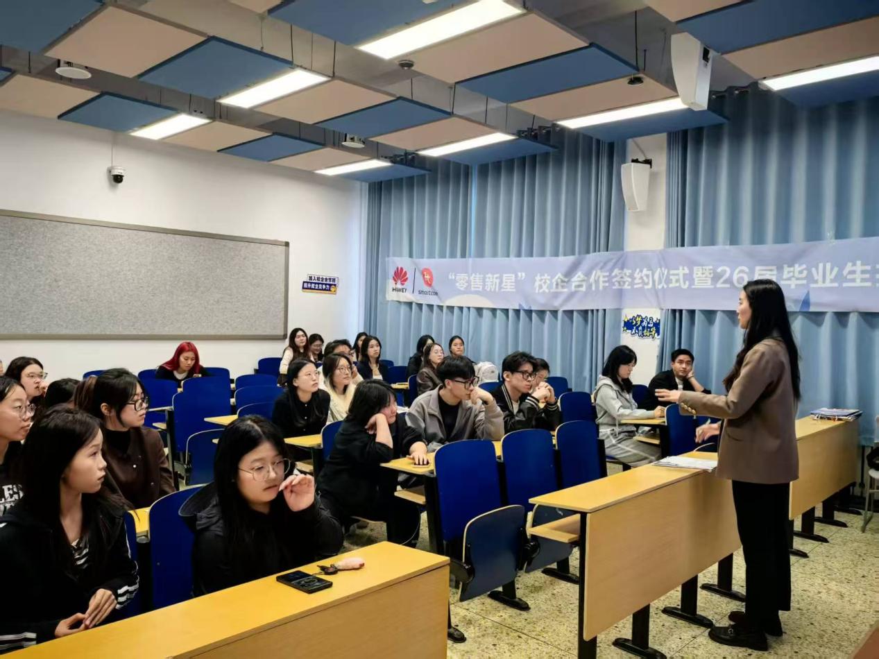 签约仪式结束后,杨雪园就“零售新星管培生”校企合作项目进行了校园招聘宣讲,系统介绍了该项目的培养计划与发展前景,并就同学们关心的问题作了细致解答。现场气氛热烈,2026届毕业生积极响应,踊跃投递简历并参与面试。