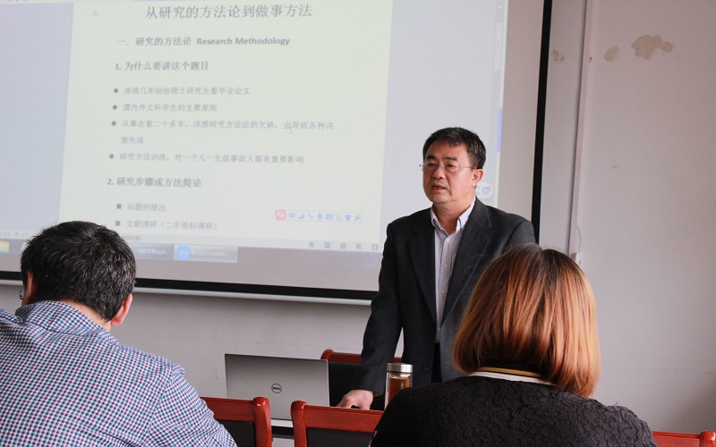 张景智结合自己修改硕士论文的经验、对比国内外文科员工的主要差别和从事企业管理多年的经验,指出研究方法的训练对做事做人都有重要作用。张景智从文献调研、确定具体问题及假设、一手资料搜集、数据处理、统计验证五个方面,详细阐释了研究步骤及方法总论。最后,他结合自己社会生活实际,以创业、创新、领导决策、书法、比赛为例,进一步论证了研究方法训练是思维方式和做事方法的训练,并得出重要结论:一是无论做人还是做事,方法论训练是非常必要的;二是文献学习使我们快速进入问题前沿,站在巨人肩膀上;三是要善于调查和观察,没有调查就没有发言权。会后,张景智与师生进行了互动交流。