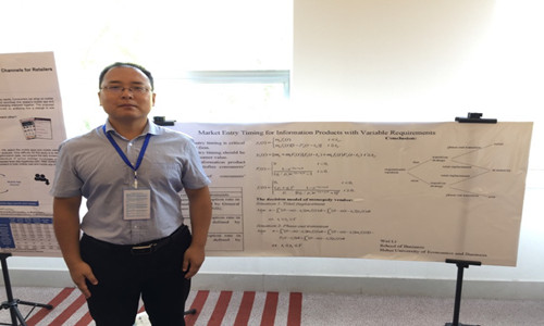 李伟老师在大会上介绍了自己的研究工作《Market Entry Timing of Information Product with Variable Requirements》,该项工作受到了与会人员的普遍关注,特别是有企业界的人士指出,李伟老师的研究工作对企业的实际工作非常有意义,因为该人士所在企业只能凭借经验决定在何时发行新产品,但是对该问题的内在决策机制并不了解,而厘清这一机制对企业的决策而言至关重要。