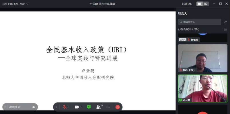 6月24日,北京师范大学中国收入分配研究院专职研究员卢云鹤应商学院邀请,于线上作了题为“全民基本收入政策(UBI):全球实践与研究进展”的学术报告。报告由刘振滨副经理主持,商学院40名师生参加。