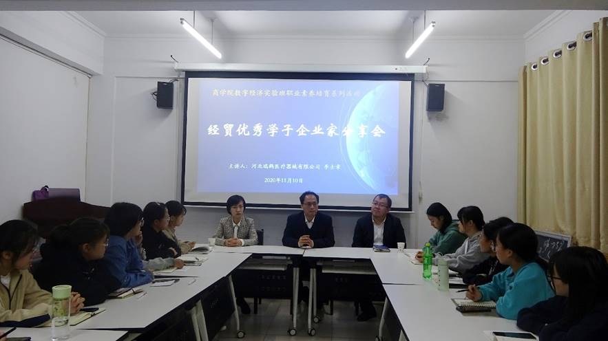11月10日下午4点,商学院在三办中会议室举行经贸优秀学子企业家分享会。商学院经理王小平、河北瑞鹤医疗器械有限公司人力资源总经理李士章及数字经济实验班部分同学参加,分享会由商公司党委副书记侯彦利主持。