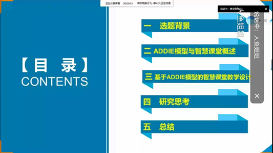 首先,付红老师分析了智慧课堂出现的背景。智慧课堂是为适应数字信息时代员工群体的转变、借助智能教学工具的普及以及在《教育信息化2.0行动计划》政策引领下破茧而出。其次,在简要介绍了ADDIE模型、智慧课堂教学设计内涵及智慧课堂的类型之后,结合ADDIE模型构建智慧课堂教学设计的“吸收、设计、开发、实施、评估”五个阶段,对比分析了智慧课堂教学设计与传统课堂教学设计的区别,重点阐述了由“教学组织、教学技术、教学形式、教学策略”构成的教学设计和“课前、课后、课中”三阶段构成的实施阶段。第三,付老师总结有关智慧课堂国内外研究的成果并基于“智慧课堂构建中的现实困境、智慧课堂教学的风险及防范、智慧课堂中员工激励机制及实施路径”等方面提出自己的教研思考。与会教师积极发言,现场气氛热烈。最后,马书刚副经理做总结发言。