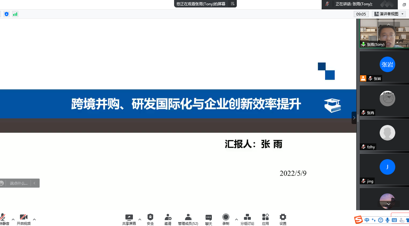 5月9日,商学院张雨博士于线上作了题为“跨境并购、研发国际化与企业研发效率提升”的学术报告。报告由商学院副经理刘振滨主持,校内外50余名师生参加了本次报告会。