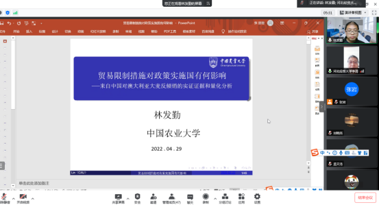 5月16日,中国农业大学经济管理学院博士生导师林发勤教授应商学院邀请,于线上作了题为“贸易限制措施对政策实施国有何影响-来自中国对澳大利亚大麦反倾销的实证证据和量化分析”的学术报告。报告由李清教授主持,院内四十余名师生参加了本次报告会。