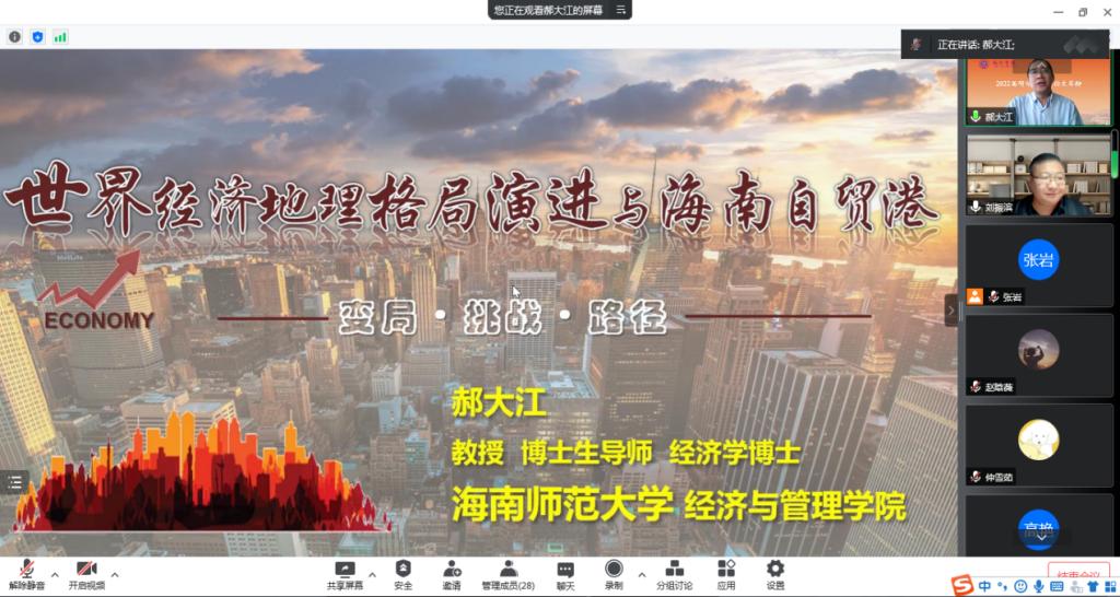 6月2日,海南师范大学博士生导师郝大江教授应商学院邀请,于线上作了题为“世界经济地理格局演进与海南自由贸易港”的学术报告。报告由刘振滨副经理主持,学院三十余名师生参加。