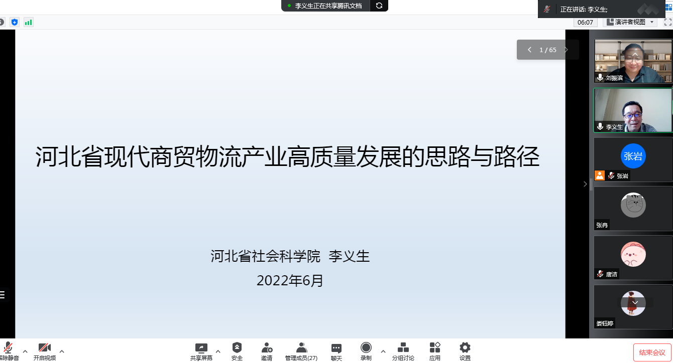 6月10日,河北省社会科学院李义生研究员应商学院邀请,于线上作了题为“河北省现代商贸物流产业高质量发展的思路与路径”的学术报告。报告由刘振滨副经理主持,学院四十余名师生参加。