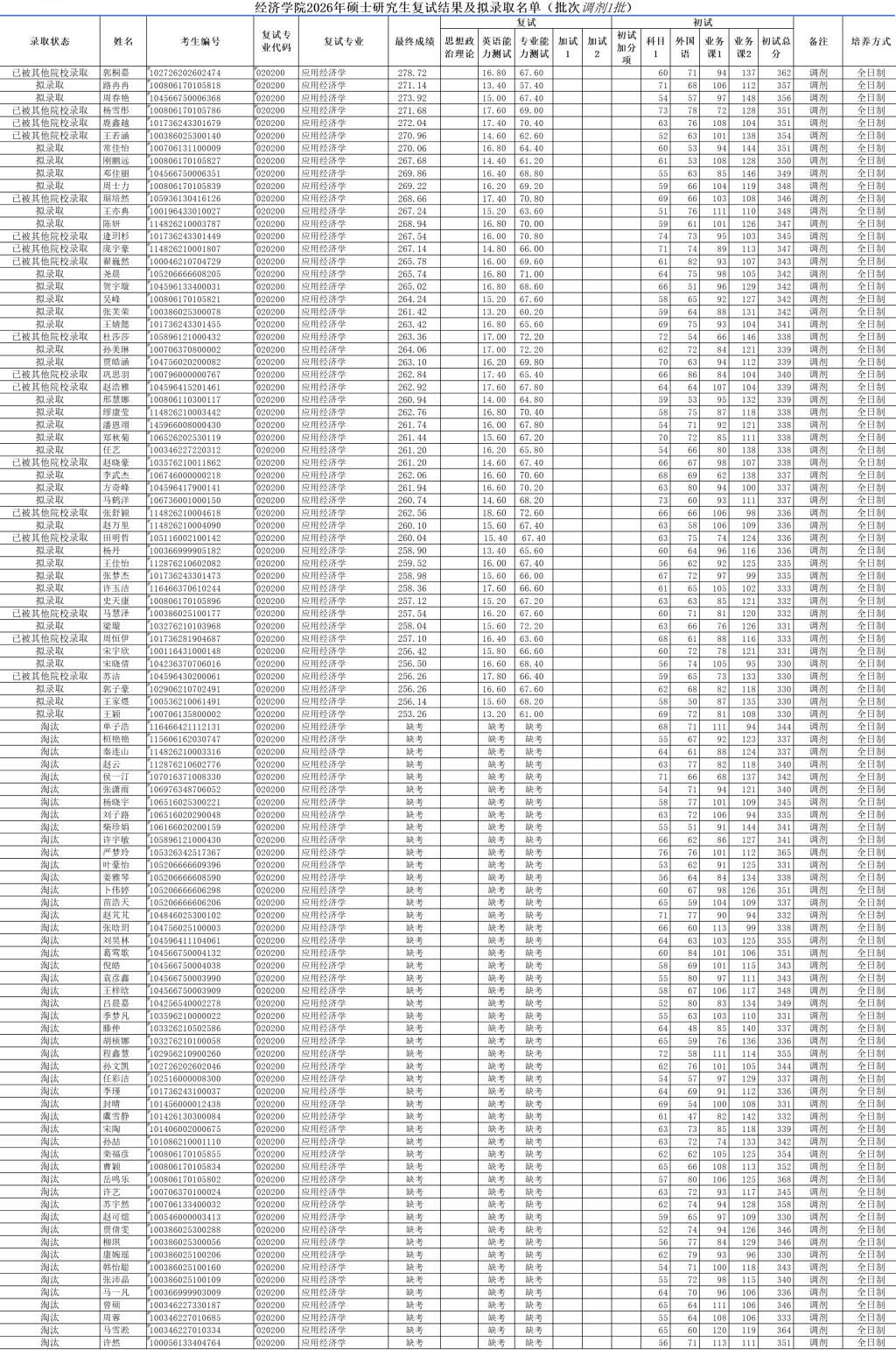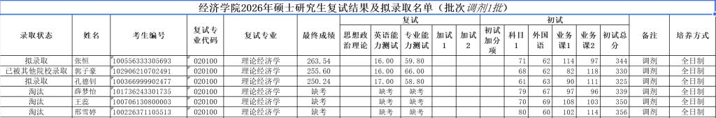 理论经济学专业2026年调剂复试(二批)考生名单