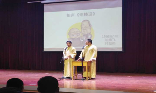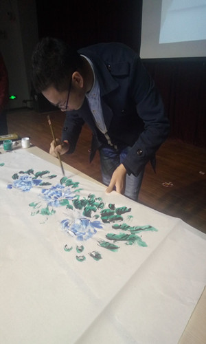 才艺交流会中,表演同学纷纷展示出精心准备的各类节目。欢快甜美的吉他弹唱“虫儿飞”,幽默风趣的相声表演“我的老员工活”等,各式各样的才艺表演不时引起台下观众的掌声喝彩。其中,2016级国际经济与贸易6班的刘贺龙带来的现场作画《牡丹图》赢得大家热烈掌声,几朵牡丹跃然纸上,令观众耳目一新、为之赞叹。最后,活动以大合唱《没有共产党就没有新中国》圆满落下帷幕。
