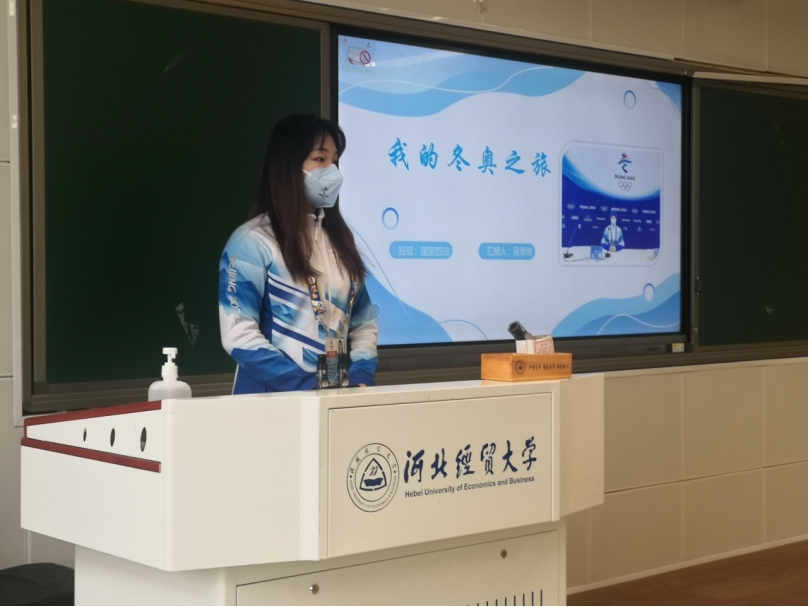 随后,国贸四班吴思琦同学讲述了她的冬奥志愿之旅。她不仅介绍了她在冬奥志愿活动中的工作,还说出了她对于此次冬奥志愿之旅的心得与感受,她表示以后自己会更加积极地投入到志愿服务当中,用实际行动为国家的发展贡献力量!