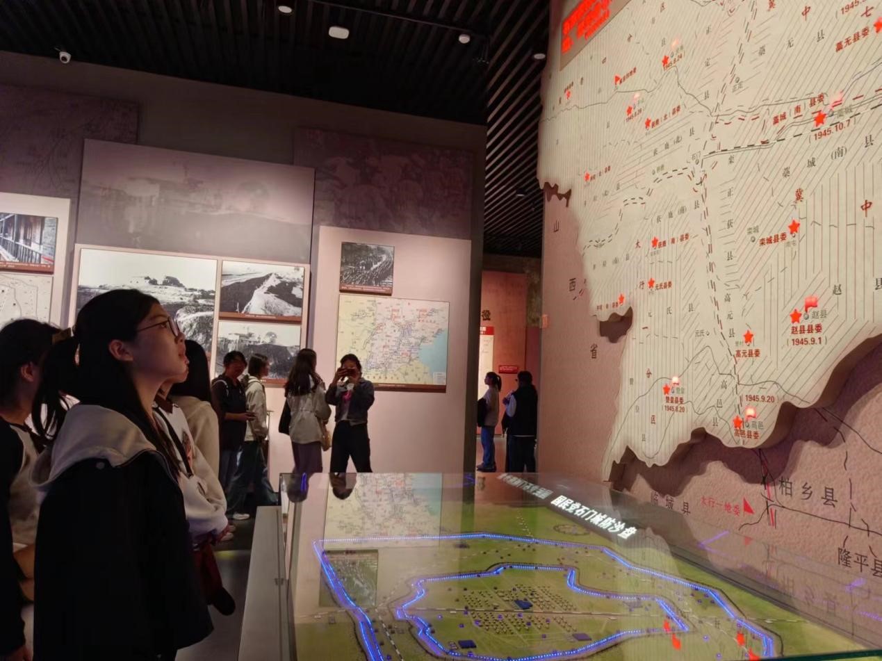 第一展厅为“石门风雨路”,该展厅通过“近代工业肇始、星火燎原、抗日烽火”三个单元讲述了石家庄一路走来的风雨历程。同学们可以看到井型煤矿、大石桥、百团大战之正太铁路西站、灌云山六壮士等一系列照片、多媒体影像和雕塑作品。同学们仿佛穿越时空,深刻感受先辈们奋不顾身的精神,进一步了解抗战胜利的艰苦卓绝。