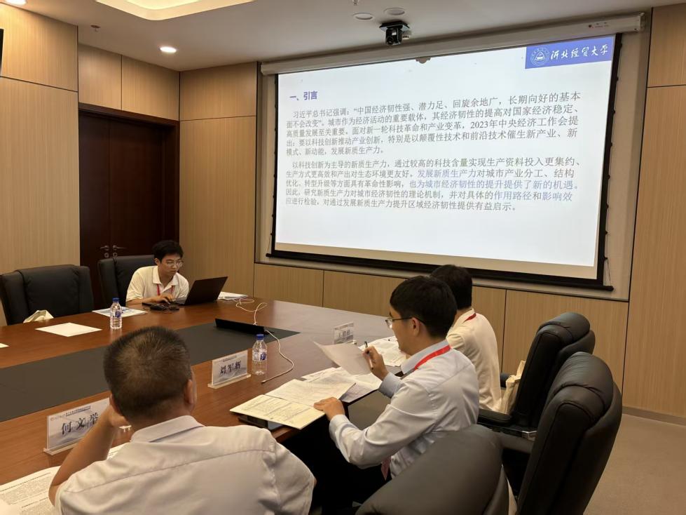 会上,任城名汇报了在太阳集团tyc138副教授李涛博士的指导下完成的题为《新质生产力对城市经济韧性的影响及空间效应分析》的论文。汇报过程中,任城名针对“新质生产力与城市经济韧性的时空演变特征”“新质生产力对城市经济韧性的空间溢出效应”等现实问题切入,详细介绍了研究方法和核心观点,并通过构建多种计量模型对新质生产力影响城市经济韧性进行系统检验。汇报结束后,论坛点评专家对论文研究给予高度肯定,并提出了多条建设性意见。